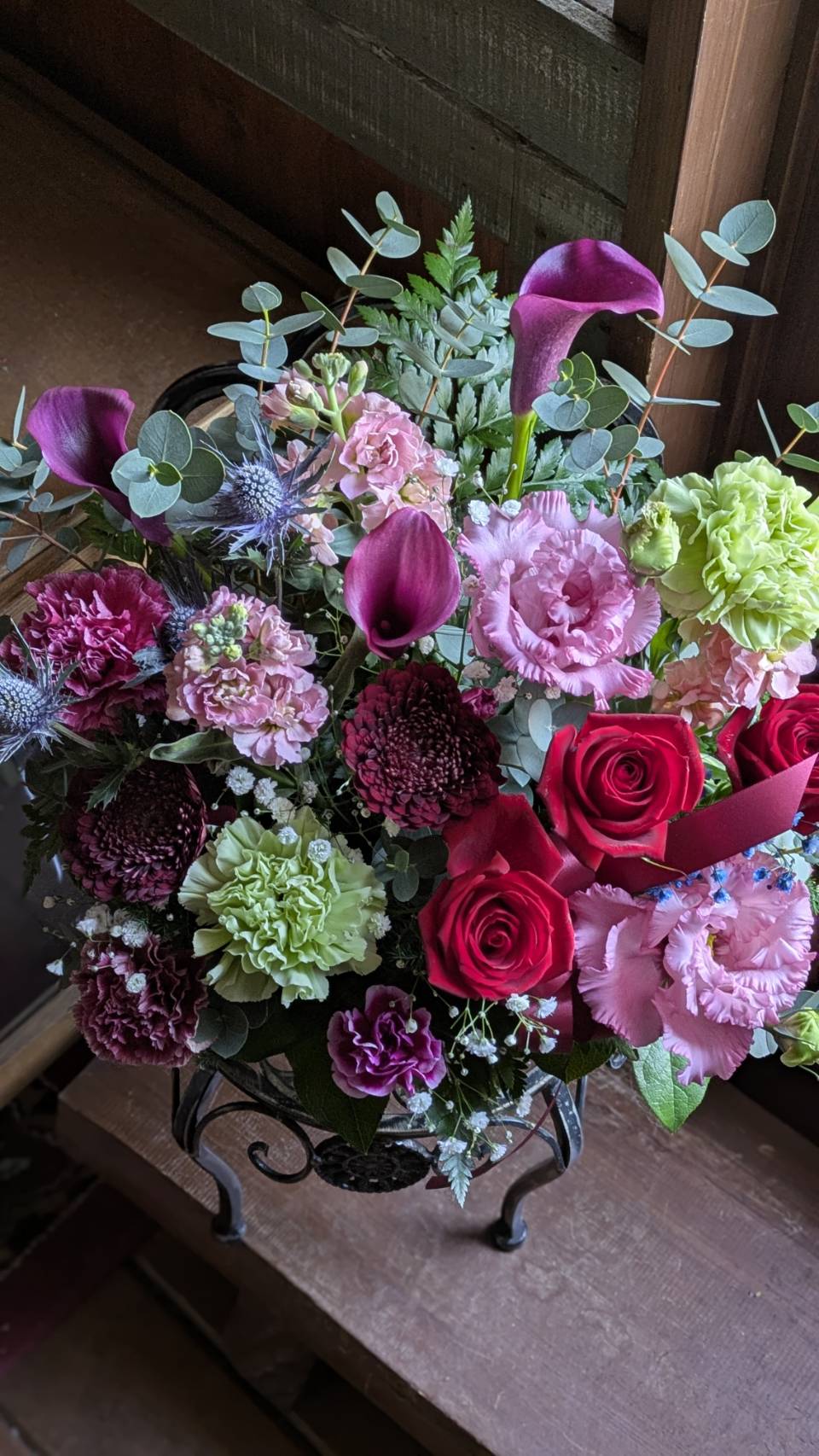 ワインレッドのカラー、青のエリンジウム。