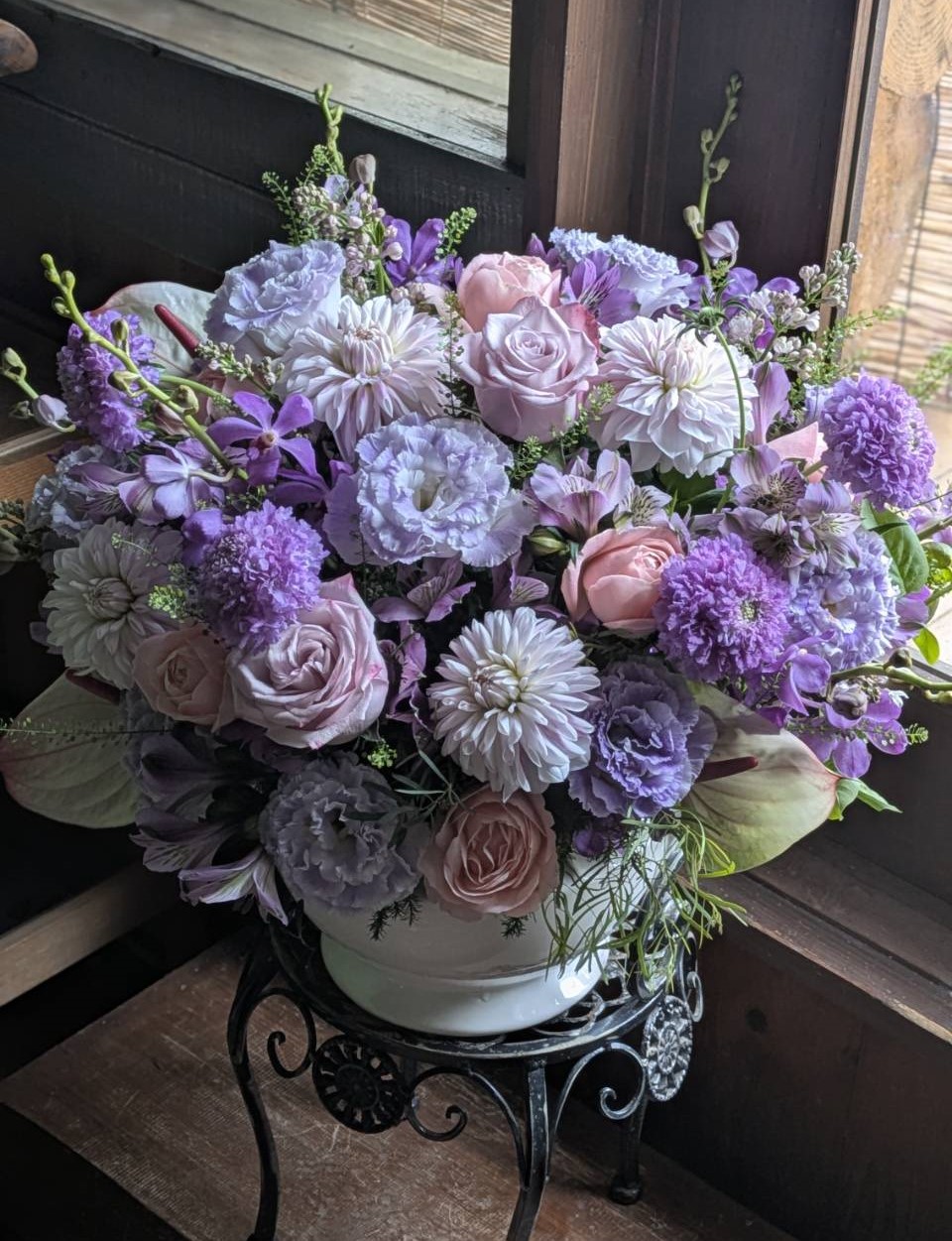 お誕生日のお祝いにオシャレなパープルカラーのフラワーアレンジメント|愛媛松山